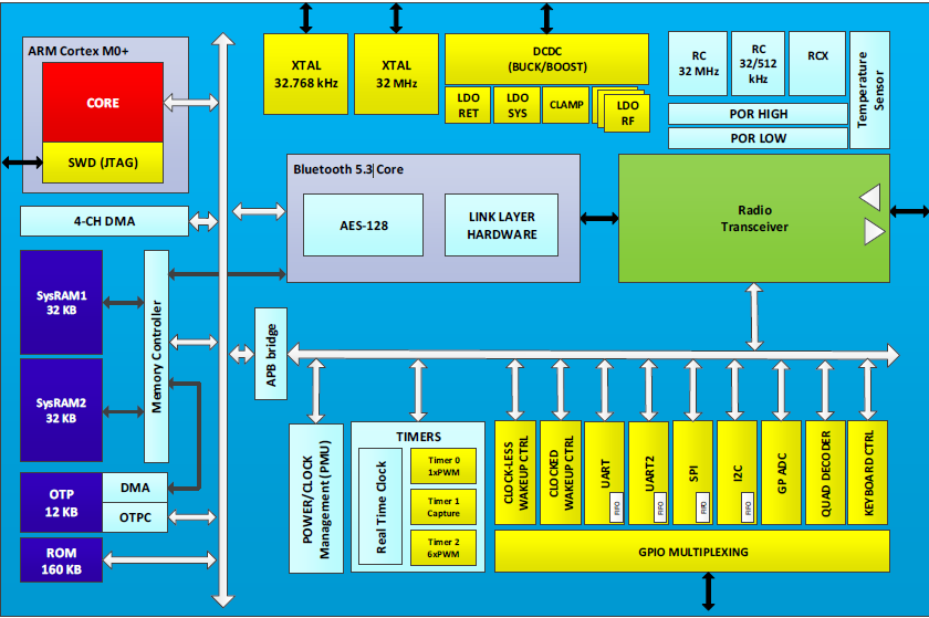 DA14535 and DA14533 in the newer member of DA1453x family which includes two SysRAMs each with 32kB of memory (64kB in total).