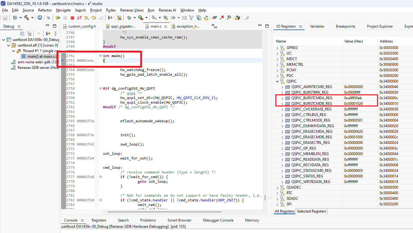 The easiest way to receive the values of flash_burstcmda_reg_value and flash_burstcmdb_reg_value is after Debug version of uartboot is built to detect the new QSPI Flash device, begin a debug RAM_DA1459x session. There, once the device has been successfully identified and the breakpoint in main() is reached, check EmbSys Registers for the values of QSPIC_BURSTCMDA_REG and QSPIC_BURSTCMDB_REG values.