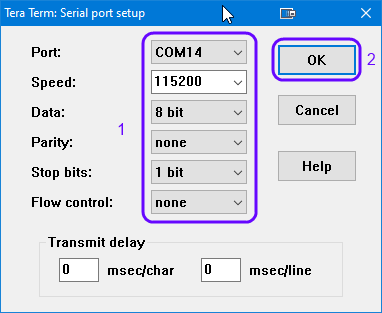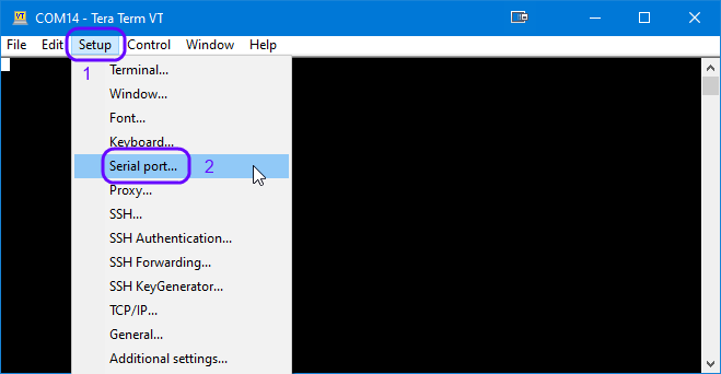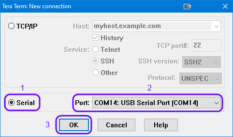 Select your favorite serial console. In this tutorial we have selected Tera Term which is a free and easy-to-use serial terminal. Follow the steps below to successfully establish a connection via the USB port. If the target device is connected to your PC it should be automatically displayed as an option (2).