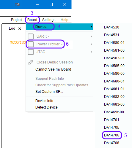 Select Board(3), Device(4) and select the BLE device on your board (5)