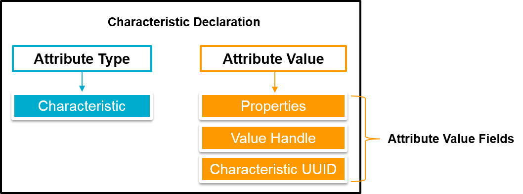 The Characteristic Value is an attribute with a type that must match the characteristic declarations’ Characteristic UUID field. Apart from that, it is an ordinary attribute. The biggest difference is that the types of actions that can be performed on this characteristic value attribute, are exposed in the characteristic declarations’ Properties field and additionally might be in the Characteristic Extended Properties descriptor.