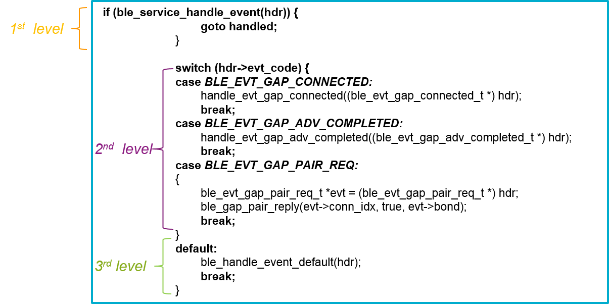 Several events can occur during the lifetime of the Bluetooth LE application and these events need to be handled in a specific manner. In all Renesas sample projects (found in the SDK) there are three levels of event handling: