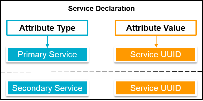 A service is grouped using a Service Declaration. This is an attribute with an attribute type of either Primary Service or Secondary Service. All attributes that follow this Service Declaration and occur before the next Service Declaration are considered grouped with this service; they belong to this service. A Primary Service is one that encapsulates what the device does. A Secondary Service is one that helps the Primary Service to achieve its behavior. All Secondary Services are referenced from a Primary Service. The service declaration’s value is a Service UUID. This is either a 16-bit Bluetooth UUID or a 128-bit custom UUID. Any service that a device does not understand can be safely ignored. To help with this, the Attribute Protocol allows the range of attribute handles of services to be discovered and only known services will be processed further.