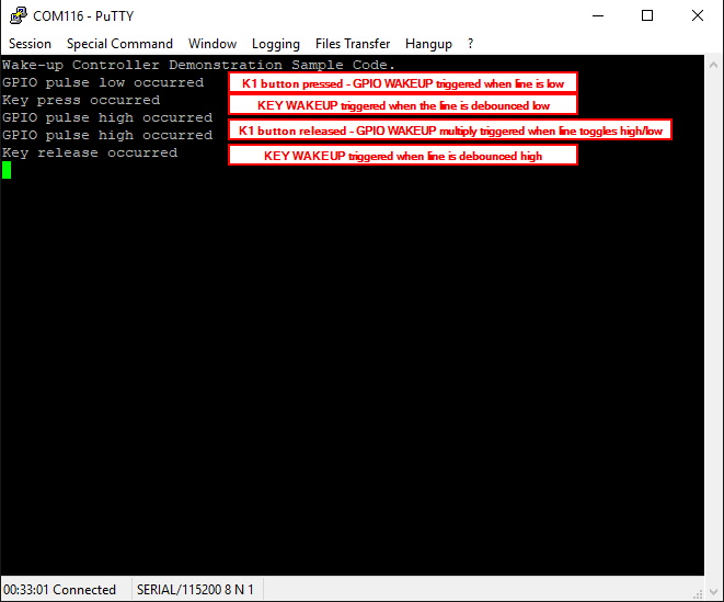Pressing K2 button will trigger only the GPIO_WAKEUP interrupt if the status of the line matches the GPIO_WKUP_TRIGGER_STATE definition setting.