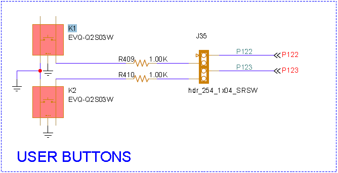 schematic indicates both of the buttons are connecting the pins to the ground when the buttons are pressed in order to create a low pulse.