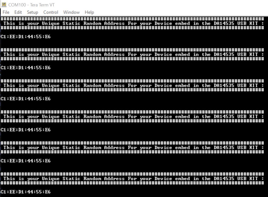 Observe the print out: The application is reading the unique random address from OTP and generate the BD address and sent it to the UART every 2 second.