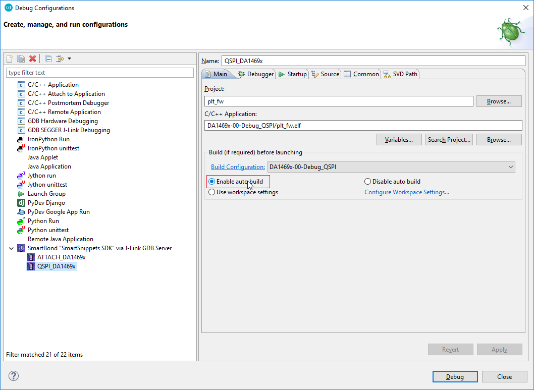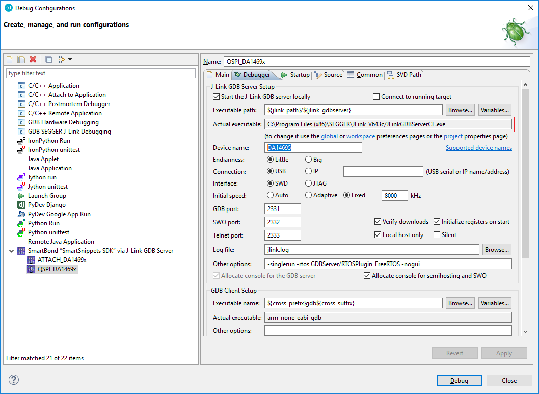 To load the code through the GDB server, configuration modification is required in Smartsnippet Studio.