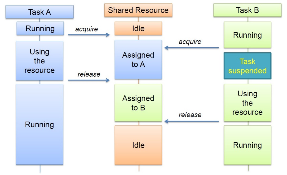 - Synchronous writing/reading operations block the calling freeRTOS task while the operation is performed using semaphores rather than relying on a polling loop approach. This means that while the hardware is busy transferring data, the operating system (OS) scheduler may select another task for execution, utilizing processor time more efficiently. When the transfer has finished, the calling task is released and resumes its execution.