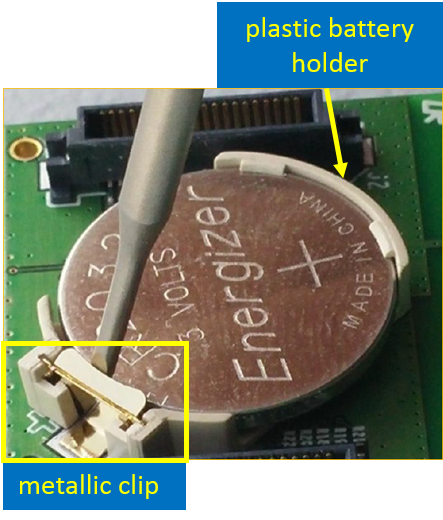 - For this demonstration, a typical CR2023 non-rechargeable coin cell battery has been selected. The battery is placed at the bottom of the daughterboard in the dedicated battery holder as illustrated in Fig. 17. The battery is inserted by first sliding it under the metallic clip of the battery holder. Extra attention is needed when removing the coin cell battery from its holder, if this is not done properly then the plastic battery holder can be subject to breaking.
